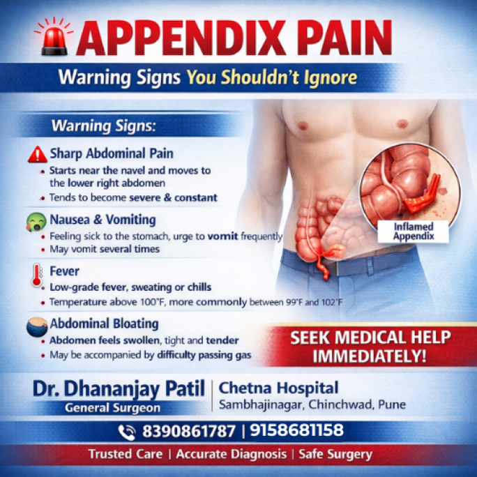 At Chetna Hospital, Chinchwad, under the care of Dr. Dhananjay Patil, an experienced General Surgeon in Pune, patients receive timely diagnosis and safe surgical treatment for appendix-related conditions. This blog explains everything you need to know about appendix pain, its warning signs, causes, diagnosis, and when to seek immediate medical help.