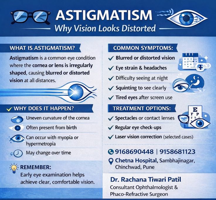 If you experience blurred or distorted vision, headaches, or eye strain, consult Dr. Rachana Tiwari Patil, Consultant Ophthalmologist & Phaco-Refractive Surgeon, at Chetna Hospital, Sambhajinagar, Chinchwad, Pune. Early diagnosis ensures the best treatment outcomes and helps you enjoy clear, comfortable vision.