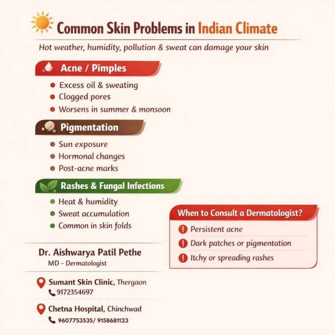 By Dr. Aishwarya Patil – Consultant DermatologistChetna Hospital, Chinchwad, Pune India’s climate is diverse and challenging—ranging from extreme heat and humidity to monsoons and pollution. While our