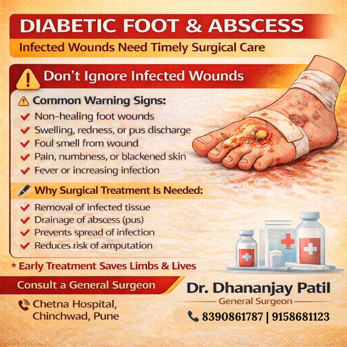 If you notice non-healing wounds, swelling, pus, or foot pain, consult Dr. Dhananjay Patil, General Surgeon at Chetna Hospital, Chinchwad, Pune. Early care and expert surgical management can prevent complications, save limbs, and restore mobility.