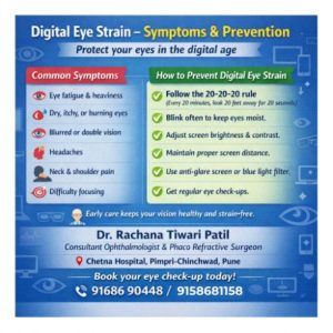At Chetna Hospital, Pimpri-Chinchwad, Pune, Dr. Rachana Tiwari Patil, Consultant Ophthalmologist and Phaco Refractive Surgeon, regularly treats patients suffering from digital eye strain and related eye problems. Early awareness and preventive eye care can help protect your vision and improve quality of life.