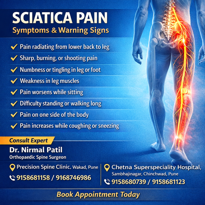 In this detailed guide, Dr. Nirmal Patil, Orthopaedic & Spine Surgeon, explains sciatica pain, its symptoms, warning signs, causes, risk factors, and when to seek expert care at Chetna Superspeciality Hospital, Chinchwad, Pune.